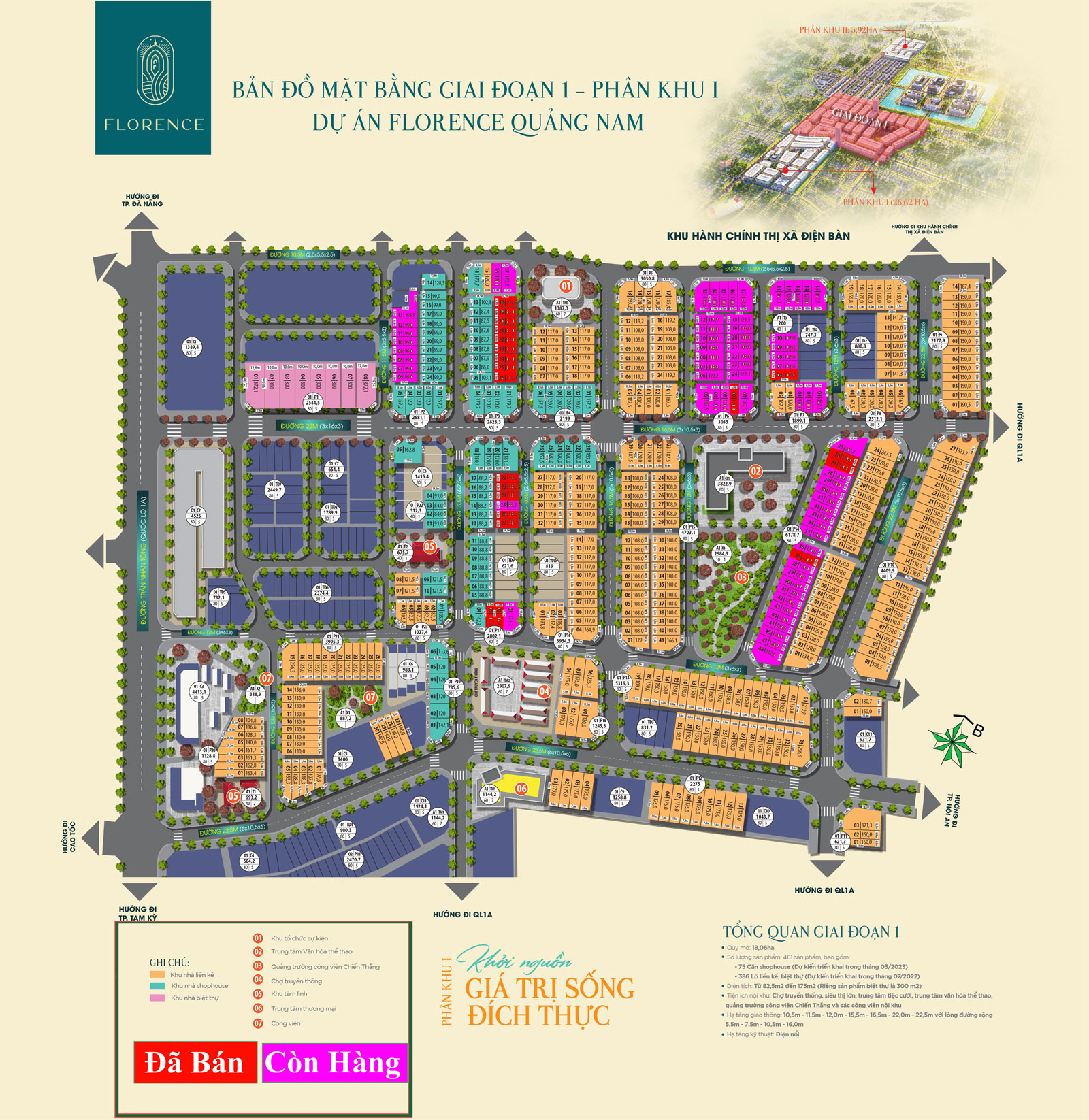 Dự án đất nền Florence Quảng Nam được triển khai trên diện tích đất có quy mô hơn 32,5ha chia thành 2 phân khu: phân khu I chiếm 26,6ha và phân khu II chiếm trên 5,9ha với tổng số có 791 bất động sản. Phân khu I gồm các sản phẩm Shophouse, biệt thự và đất nền liền kề và phân khu II gồm Shophouse và đất nền liền kề. Điểm đặc biệt của dự án này so với các dự án đất nền và Shophouse khác là mật độ xây dựng thấp, phân khu I chỉ 31,8% nhưng sang đến phân khu II thì mật độ xây dựng chỉ chiếm 22,7%.