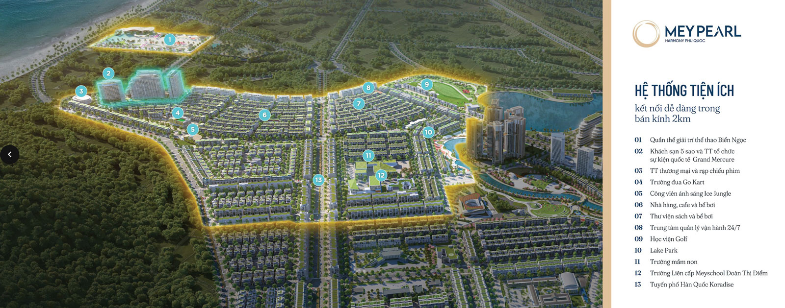 Meypearl Harmony Phú Quốc là dự án quần thể khách sạn và chung cư 5 sao sở hữu lâu dài được phát triển bởi chủ đầu tư Hàm Ninh Kiên Giang và đơn vị phát triển dự án là Công ty cổ phần bất động sản tập đoàn Tân Á Đại Thành – Meyland. Chung cư Meypearl Harmony Phú Quốc nằm tại phân khu Aqua, thuộc giai đoạn 1 của đại đô thị Meyhomes Capital Phú Quốc, hướng về biển Bãi Trường, kề bên Khách sạn 5 sao Grand Mercure. Dự án Meypearl Harmony Phú Quốc gồm 3 tòa căn hộ chung cư với hơn 1.138 căn hộ cao cấp, 100% sở hữu lâu dài, hơn 85% căn view biển, 100% có ban công.