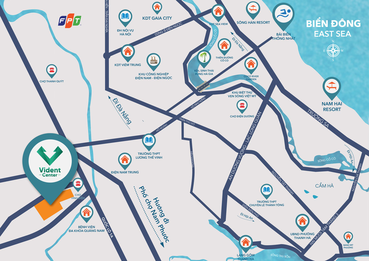Dự án Vident Center có vị trí đắc địa thuộc Phường Điện An và phường Vĩnh Điện trong trung tâm Thị xã điện Bàn, liền kề chợ Vĩnh Điện, cách QL1A chỉ 400m, cạnh 2 thành phố lớn: Thành phố trực thuộc trung ương Đà Nẵng và Thành phố di sản Hội An